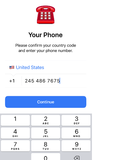 登录使用: 首先打开app,选择国家代码(例如,+1),然后输入你购买的号码,如图: